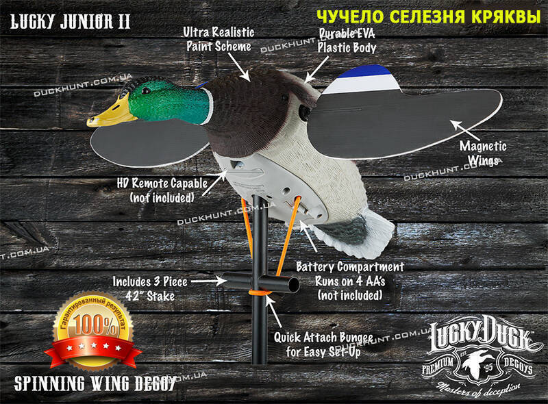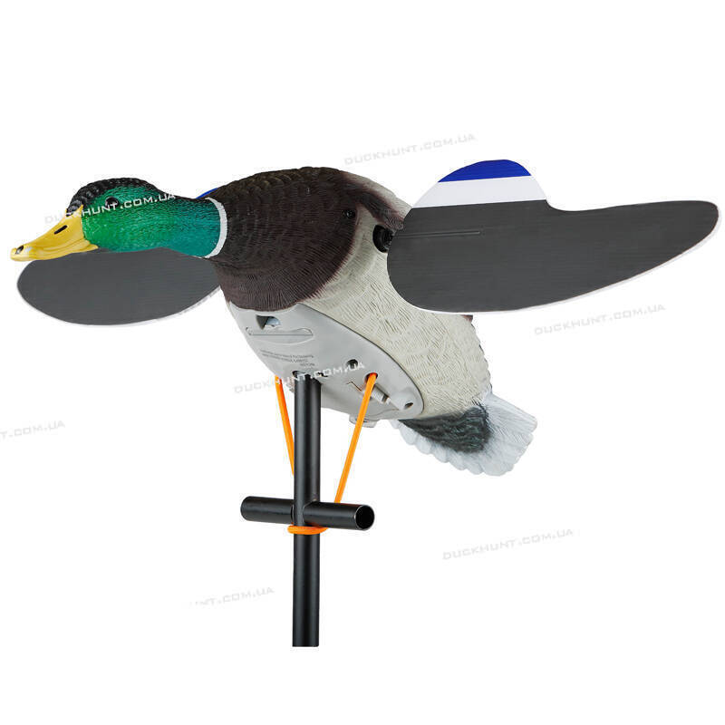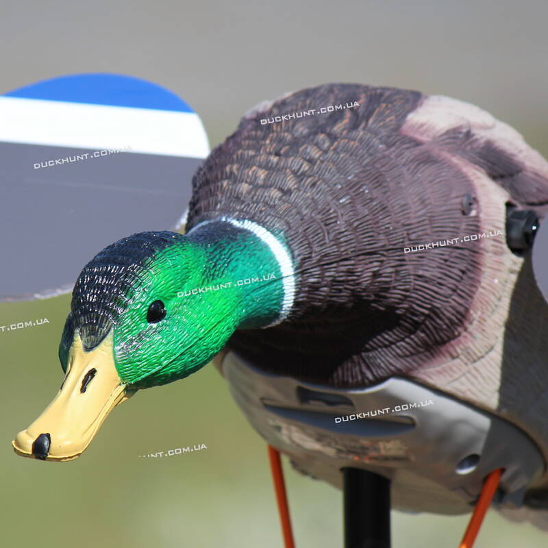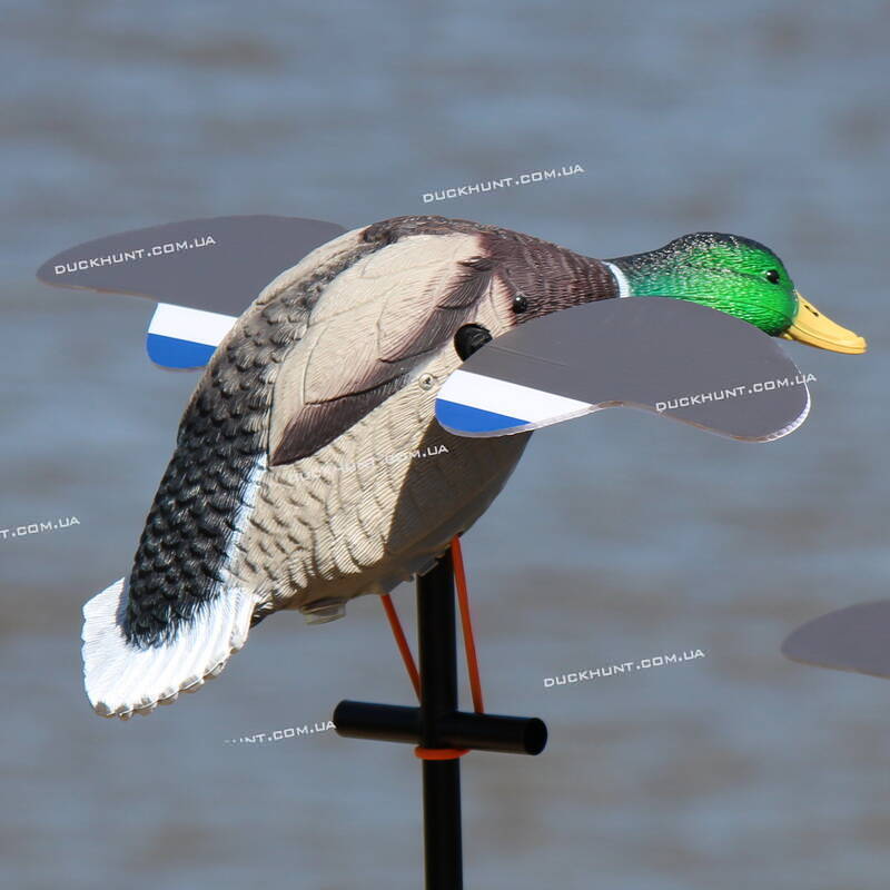 За счёт вращающихся крыльев, чучела имитирует посадку утки, чем привлекает внимание всех водоплавающих. Крылья имеют магнитный коннектор и приводятся в движение при помощи электропривода. Корпус изготовлен из пластика "EVA" (мягкий пластик-легкий и эластичный полимерный материал), детальная прорисовка оперения, реалистичный окрас и форма чучела. Новый вариант крепления чучела на стойку, установка занимает считанные секунды, при транспортировке из-за отсутствия выпирающих частей занимает намного меньше места. Работает от четырех батареек АА.