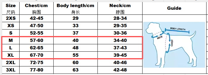 Для забезпечення ідеальної посадки захисного жилета та максимального захисту, ретельно виміряйте свого собаку. Детальні розміри наведені в таблиці нижче: